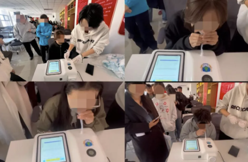 近日,环境健康研究院在内师大盛乐校区进行了基于呼出气检测的疾病快速筛查示范工作,此次示范是在北京大学、北京工匠生物科技有限公司联合科研团队的支持下合作开展的。呼出气检测是一种非侵入性、快速、便捷的疾病检测方法,近年来在医学研究和临床筛查中备受关注。此次实验采用了呼出气体中的气体生物标志物分析方法,通过无创快速吹气的检测方式,通过分析呼出气中的挥发性有机化合物(VOCs)和其他气体成分,能够获取与多种病原体感染以及其它疾病相关的气体标志物指纹信息,从而对特定病原体感染和其它疾病进行早期快速筛查。与传统的血液检测或组织取样相比,呼出气检测无创、无痛,且具有检测快速、成本较低的优势。这种方法尤其适合用于病原体感染“安检”以及其它疾病的早期诊断和大规模人群筛查,特别是在资源有限、医疗基础设施相对落后的地区。