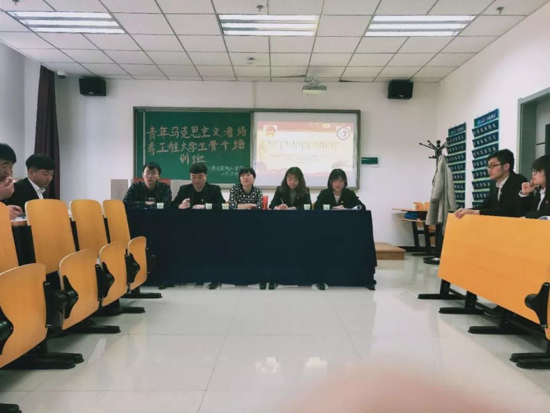 9728太阳集团于2019年3月22日下午在理工楼B306举行青年马克思主义者培训工程大学生骨干培训班的开班仪式,到场的有党委副书记、副院长胡日查老师,团总支负责人王淑娟老师、学院辅导员何朝鲁门老师和白赛纳老师、学生会副主席明明和宋志浩。