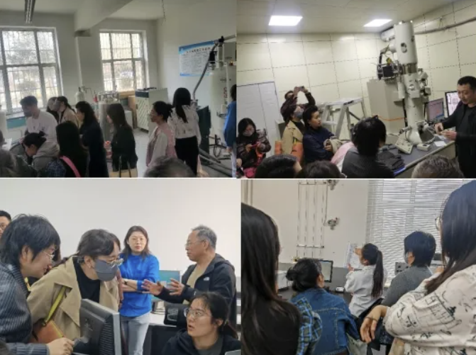 刘子忠、徐爱菊等老师陪同参观。重点实验室的爱军老师向一中老师们介绍并展示科研仪器——透射电镜,老师们相互探讨、深入交流。