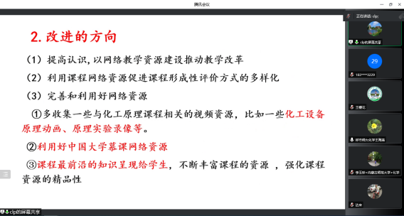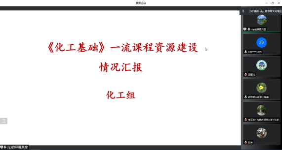 陈丽萍老师对《化工基础》一流课程资源建设进行介绍。陈老师主要从课程资源内容和改进的方向两个方面进行详细阐述,并强调《化工基础》一流课程资源建设对于未来线上线下混合式教学非常重要。