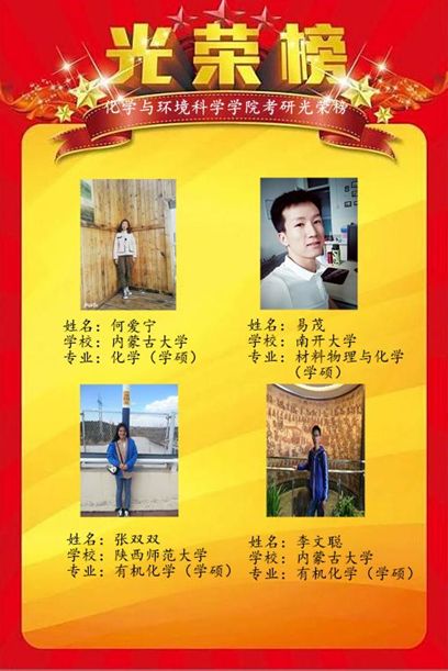 我院2019届本科毕业生共有208人,考研录取48人,考研升学率为23%。其中,2015级环境科学汉班39名毕业生中,有15人被录取,考研升学率为38.5%;2015级化学汉班57名毕业生中,有17人被录取,考研升学率为29.8%;2015级化学蒙班55名毕业生中,有9人被录取,16.4%;2015级材料化学班29名毕业生中,有7人被录取,考研升学率为24.1%。
