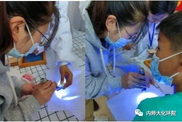甲基-螺吡喃溶液通过紫外灯照射后会显现出不同的颜色,志愿者们通过有趣的故事降解变色机理,同学们动手操作观察颜色的变化,激发他们对科学的探索。