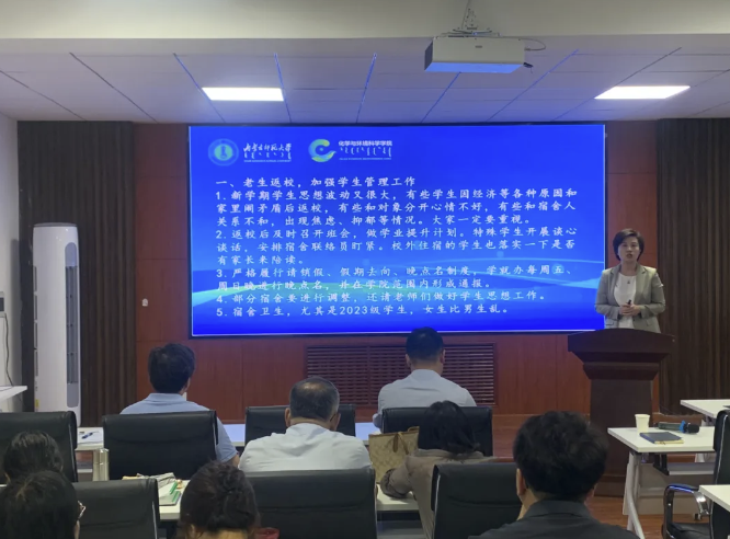 范磊传达了学校秋季学期学生工作、就业工作会议精神,通报了我院2024届毕业生就业创业工作情况,部署了新学期老生返校、新生报到的具体工作,希望老师们密切关注学生身心状态,做好学生思想工作,助力学生全面发展。