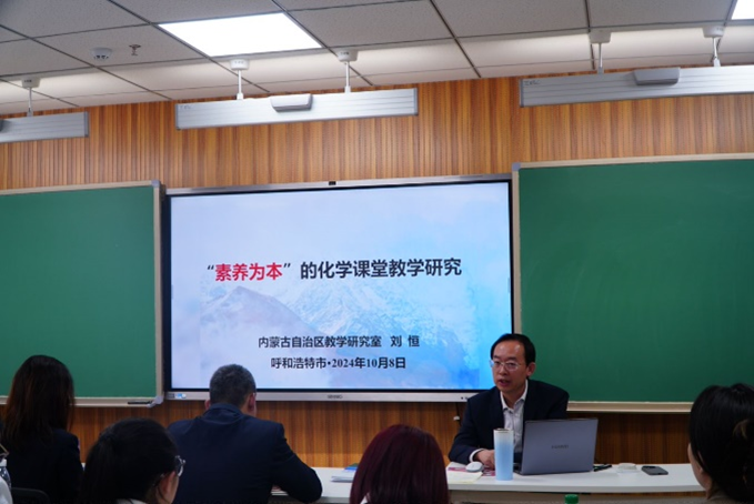 活动最后,由刘恒老师进行点评与总结,并开展题为《“素养为本”的化学课堂教学研究》主题讲座,总结了当前呼和浩特市教研工作的发展情况以及未来内蒙古自治区中考的趋势,并介绍了“说播课”的定义,通过说播课后的反馈与反思,教师可以更清晰地认识到自己在教学过程中的优点与不足,进而调整教学策略,提升教学质量。