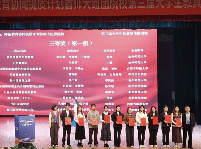 10月31日至11月2日,师范教育协同提质计划首师大组团院校第三届大学生教具制作邀请赛复赛在杭州师范大学落幕。我院学子李思瑶、李佳垚凭借创新实力脱颖而出,其参赛作品“AI赋能的酸碱中和滴定实验”荣获三等奖,充分展现了化环院学子在教学工具创新设计与实践应用中的扎实功底。