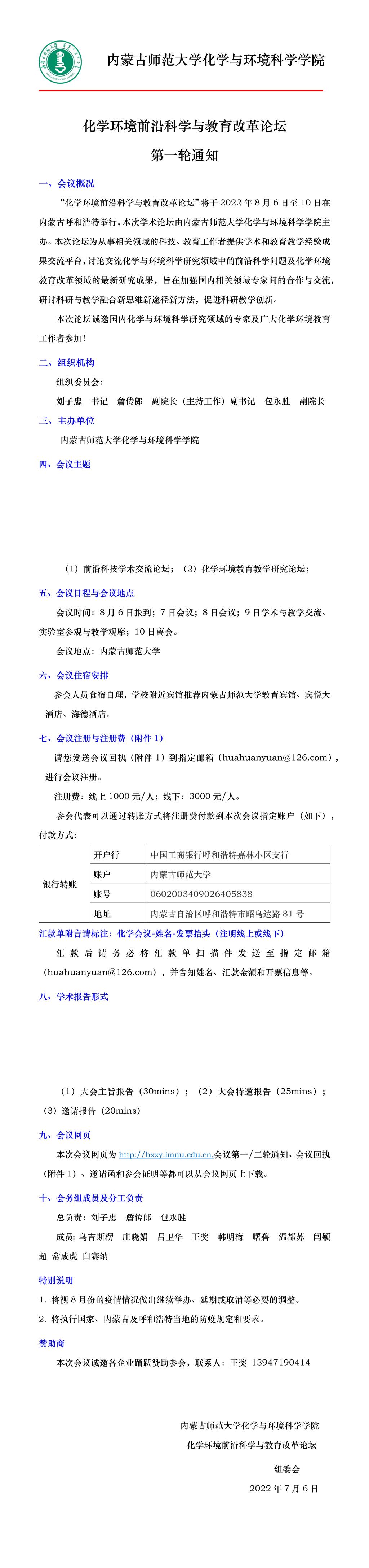 9728太阳集团化学环境前沿科学与教育改革论坛第一轮通知
