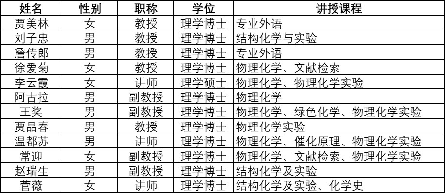 物理化学教研室是一个教育创新队伍,经过几代人的建设和传承,形成了教育理念先进、学术思想领先,治学严谨的团队风格。物理化学教研室现有教师12人,其中教授5人,副教授4人,讲师3人;教师中博士学位者获得者11人。教师队伍中现有博士生导师4人,硕士生导师9人。